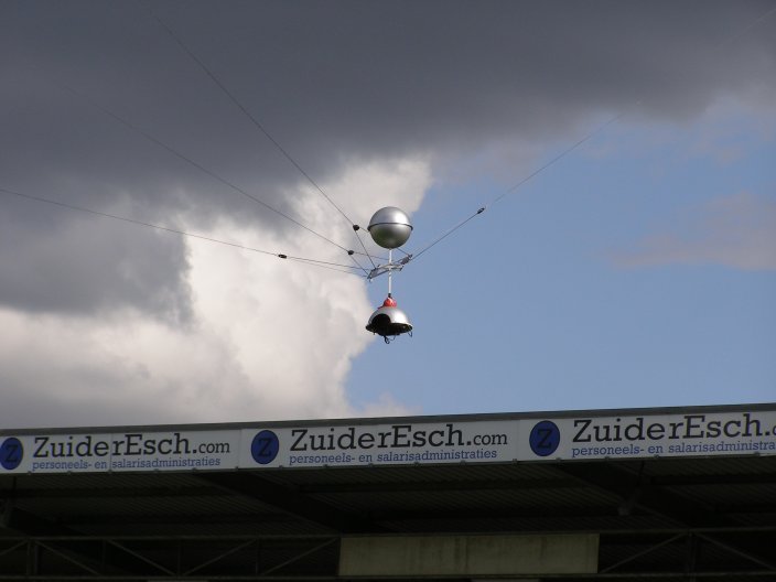 Vier lieren trekken exact synchroon aan de lijnen waar de camera aan hangt zodat de camera in elke 3-D richting over het veld